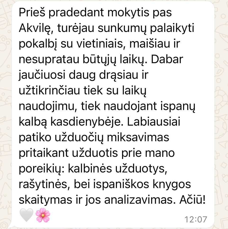 Mokytoja ir pats kursas labai patiko – viskas aišku, suprantamai pateikta, pamokos pritaikytos mano supratimo lygiui ir poreikiams. Džiaugiuosi, kad tęsiu mokymąsi toliau ir tikrai rekomenduoju šį kursą visiems, kurie nori patobulinti ispanų kalbą kelionėms ar kasdieniam bendravimui.