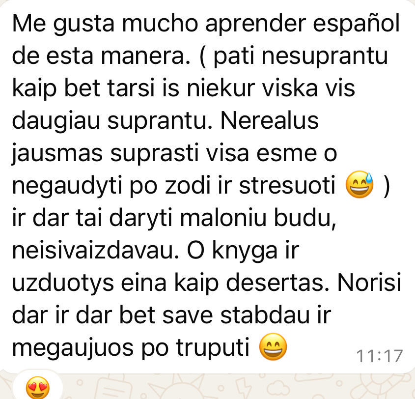 „Pamačiau YouTube video kaip vyksta mokymas ir iš karto panorau išbandyti. Su ispanų kalba buvau truputį susidūręs, bet tikrai nedaug, o tikslas buvo kuo daugiau suprasti ir išmokti kalbėti. Prasimokiau pirmą pradinukų lygį, patiko LABAI. Mokytis per istorijas labai lengva, o ir gyvas bendravimas apie gyvenimiškus dalykus per Whatsapp puikus dalykas. Labai dėkoju para la profesora Akvilė Dominyka ir iki susitikimo kitame etape.“